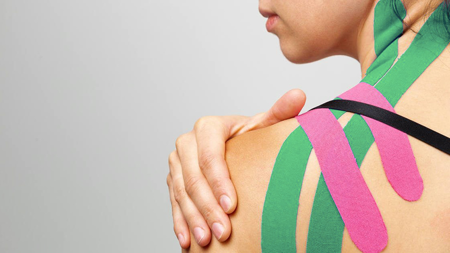 Pratica curativa per leggeri infortuni muscolari che prevede l’applicazione di tape sulla pelle, ad azione drenante e stabilizzante.
